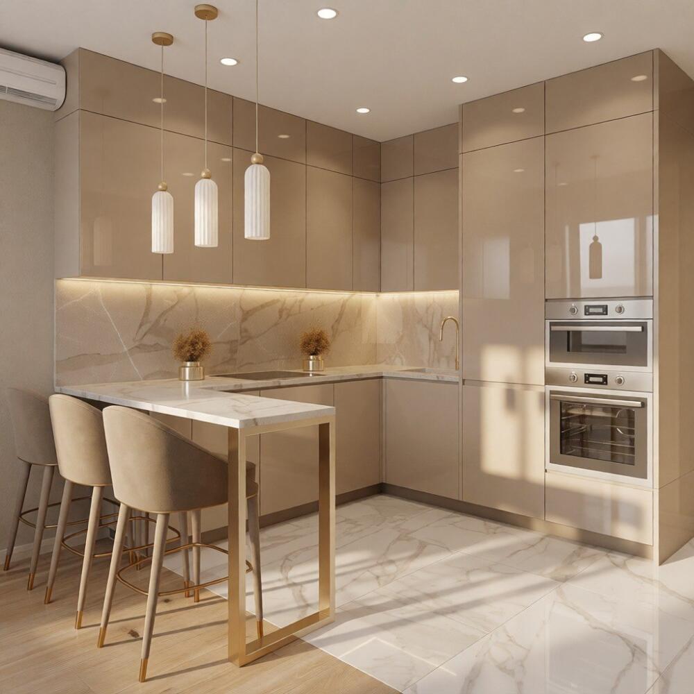 Эта кухня, воплощающая собой современную элегантность, излучает тепло и изысканность. Бежевые глянцевые фасады шкафов создают ощущение простора и света, отражая мягкое естественное освещение, которое проникает в помещение. Эти гладкие поверхности придают кухне минималистичный, но в то же время luxious вид, идеально сочетаясь с общим дизайном.