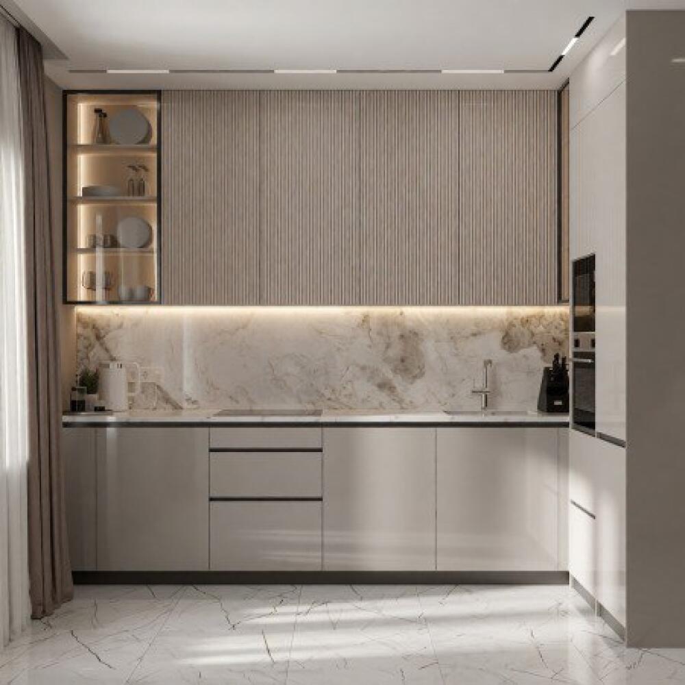 Фасады кухни выполнены из высококачественного МДФ с матовым покрытием в нейтральных, приглушенных тонах. Вертикальная фрезеровка верхних шкафов добавляет текстуры и визуального интереса, напоминая о натуральных материалах и придавая кухне особый шарм. Столешница и фартук из керамогранита, имитирующего мрамор с благородными прожилками, подчеркивают изысканность дизайна и обеспечивают исключительную прочность и долговечность. Открытые полки в стеклянной витрине с интегрированной подсветкой служат стильным решением для хранения и демонстрации посуды и декоративных элементов.