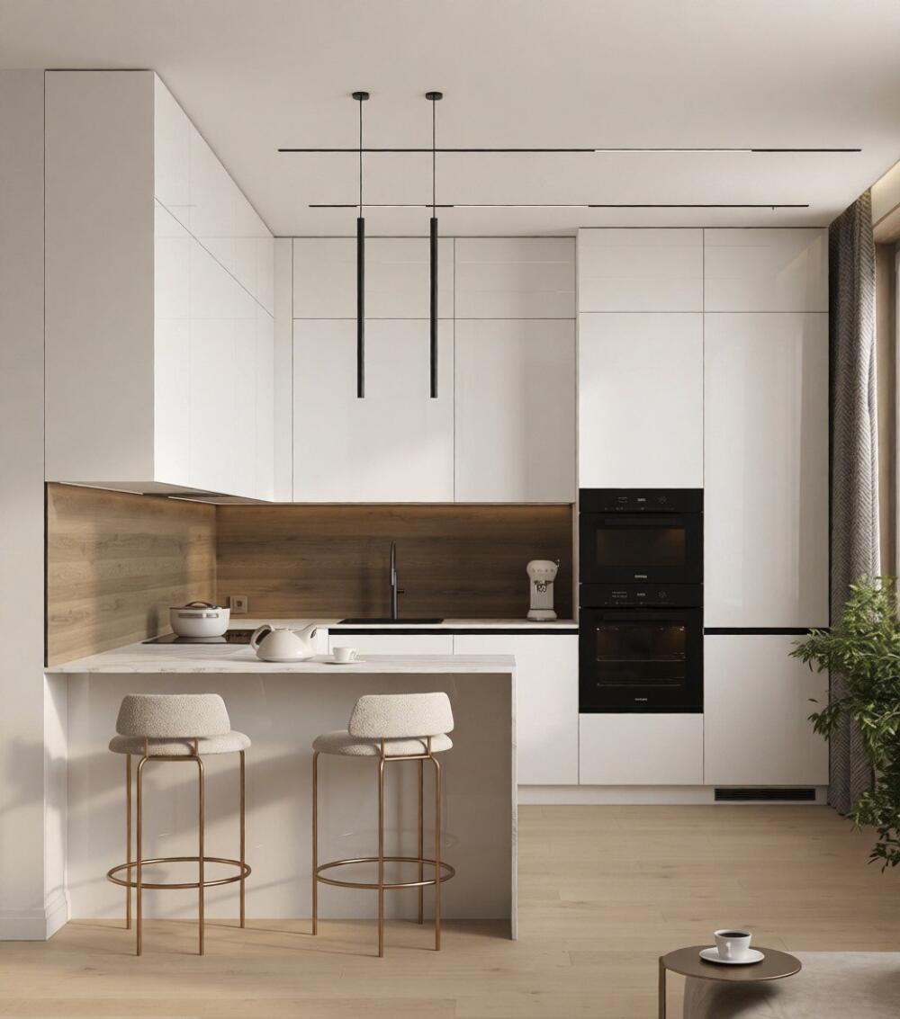 Дополняют образ кухни "Чистота Линий" стильные барные стулья с мягкой обивкой кремового цвета, установленные у барной стойки. Их золотистые металлические ножки добавляют изысканности и элегантности. Напольное покрытие из светлого дерева гармонирует с деревянным фартуком, создавая единое и целостное пространство. Эта кухня – не просто место для приготовления пищи, а оазис спокойствия и стиля, где каждая деталь говорит о безупречном вкусе ее владельца.