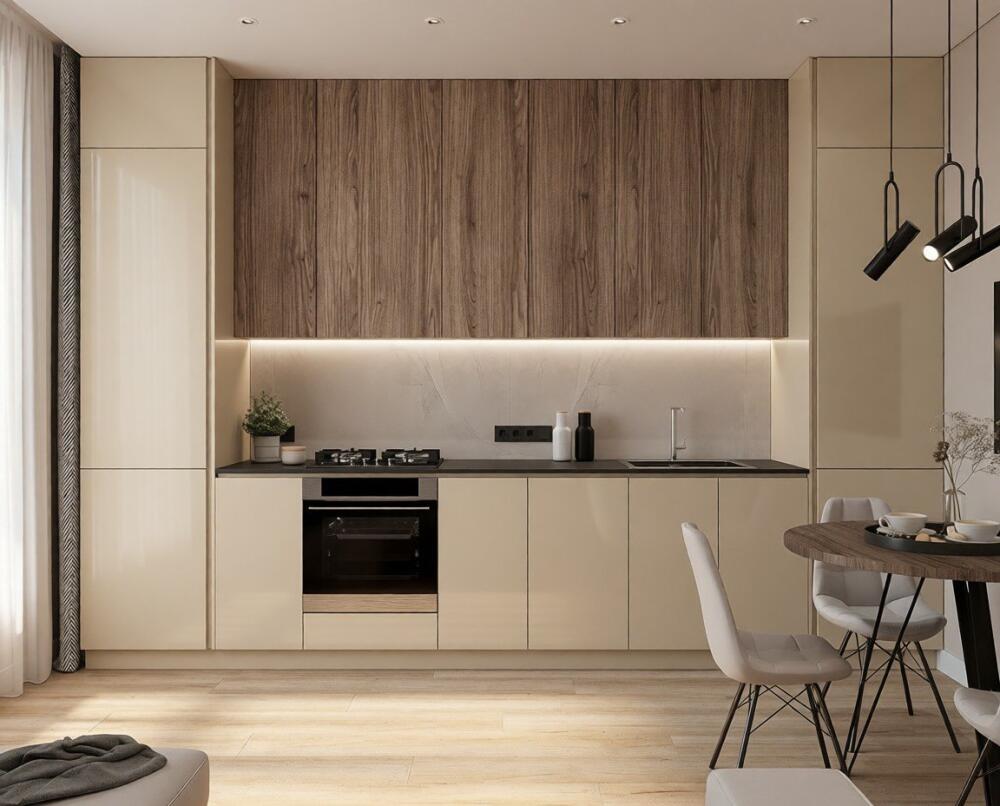 Нижние фасады, исполненные в глянцевом покрытии нейтрального кремового оттенка, отражают свет, делая кухню еще более просторной и светлой. Их гладкая, безупречная поверхность лишена ручек, что придает кухне минималистичный и футуристичный вид, где главенствует чистая линия. Интегрированные механизмы открывания обеспечивают легкий доступ ко всем секциям, сохраняя целостность дизайна.