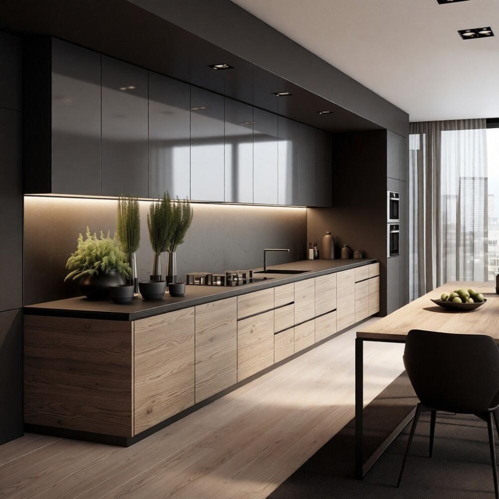 Кухня "Тефанс" идеально вписывается в современные интерьеры, такие как лофт, минимализм, хай-тек и неоклассика. Сочетание темных и светлых тонов, гладких поверхностей и натуральных текстур создает баланс, который делает пространство визуально привлекательным и гармоничным. Открытая планировка, где кухня плавно переходит в обеденную зону, делает эту модель идеальным выбором для современных квартир и студий. Современный обеденный стол с черным металлическим каркасом и деревянной столешницей, а также эргономичные стулья черного цвета, завершают композицию, создавая единое и стильное пространство для жизни и общения.